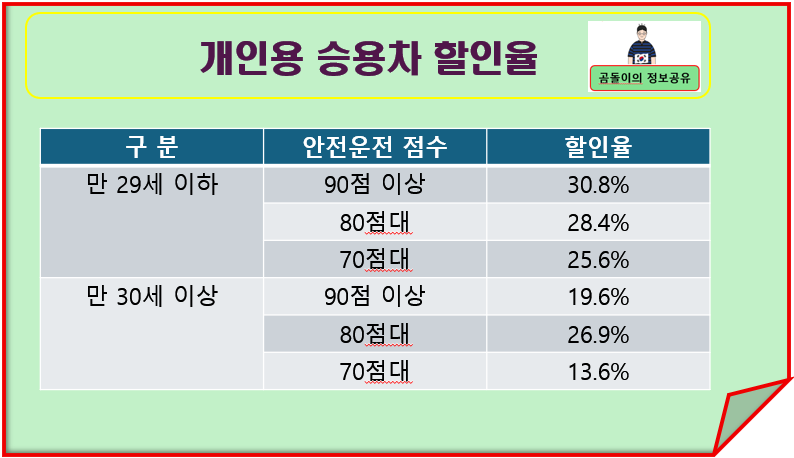 - 운전 범위 ▶ 본인만 운전하는 경우 보험료가 낮아지고, 가족 또는 지정된 운전자 범위가 넓어지면 보험료가 인상됨.