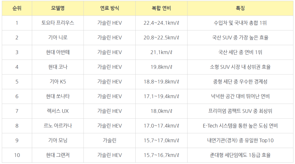 자동차 연비 순위 top 10
